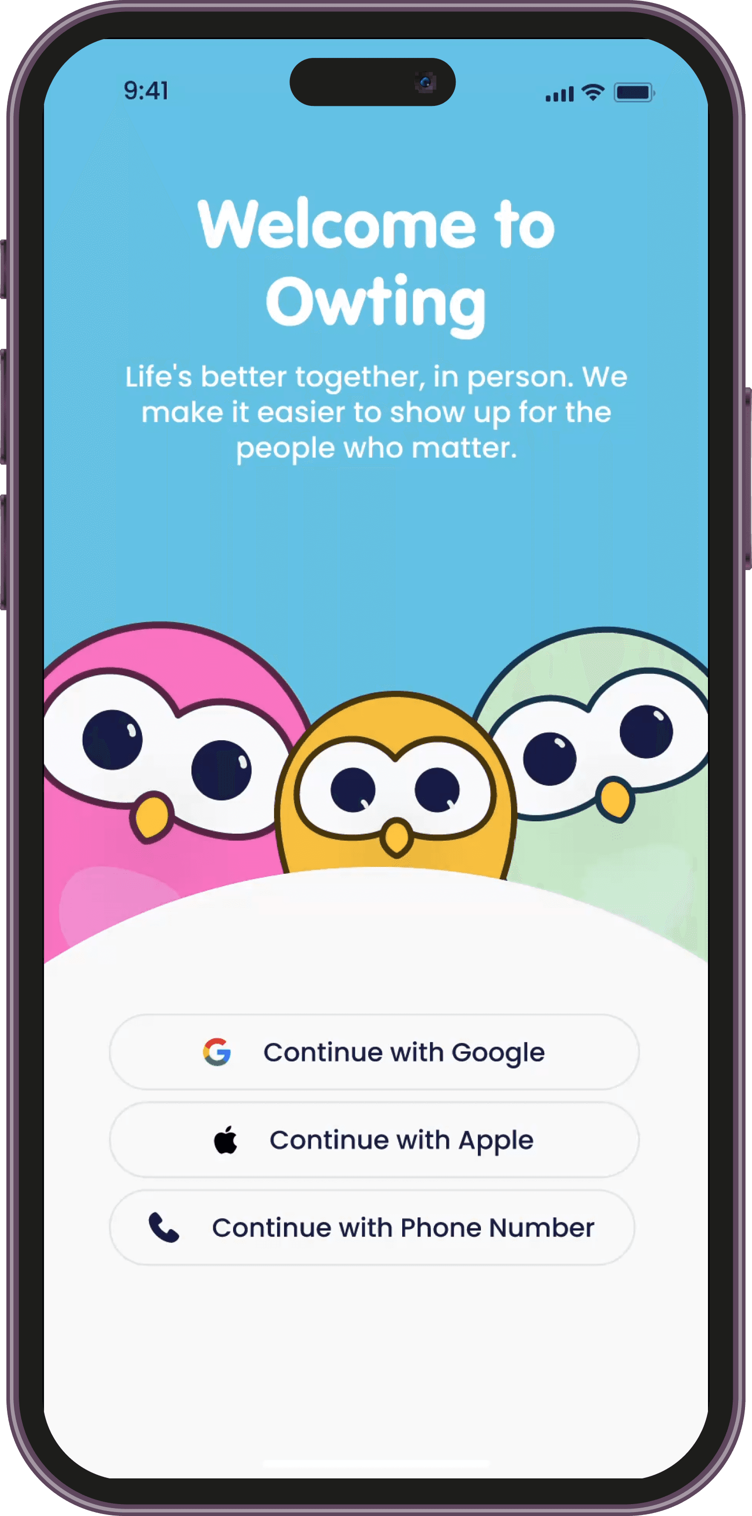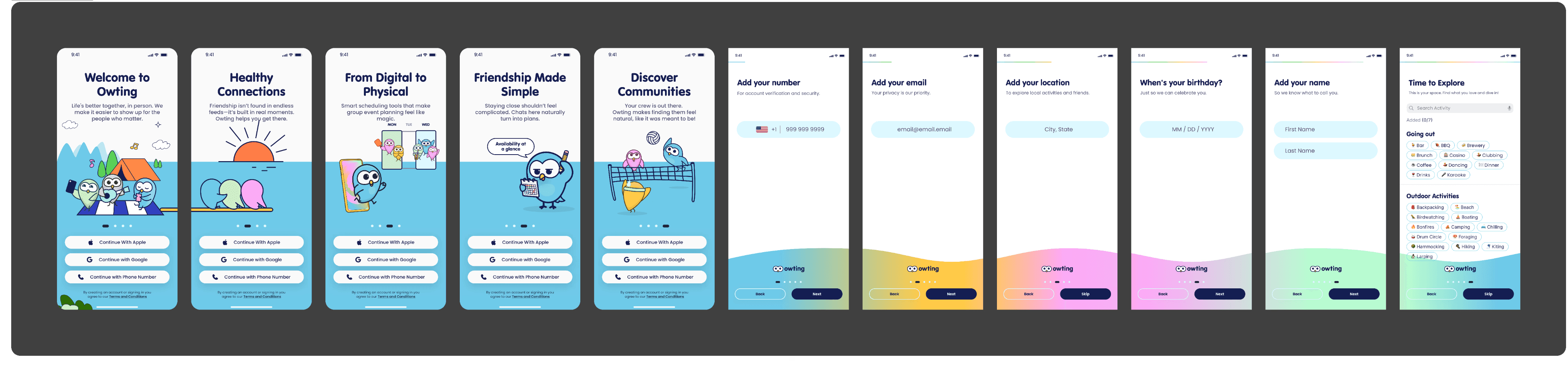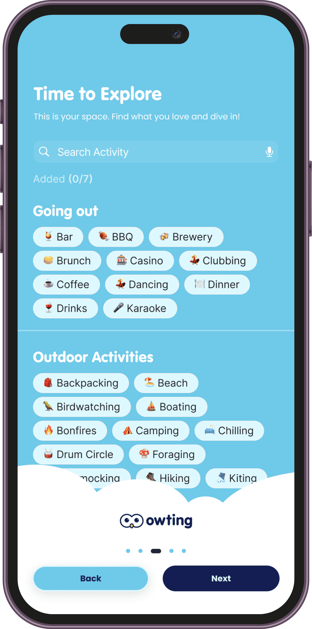 Owting connects people through shared activities and turns "we should hang out" into real plans. I redesigned the onboarding experience to reduce drop-off and guide users to their first message faster. The old flow had outdated visuals, unclear progress indicators, and dropped users onto an empty events page. My redesign introduced cohesive visuals, reimagined interactions, and redirected users to chat where they could immediately connect with their community.